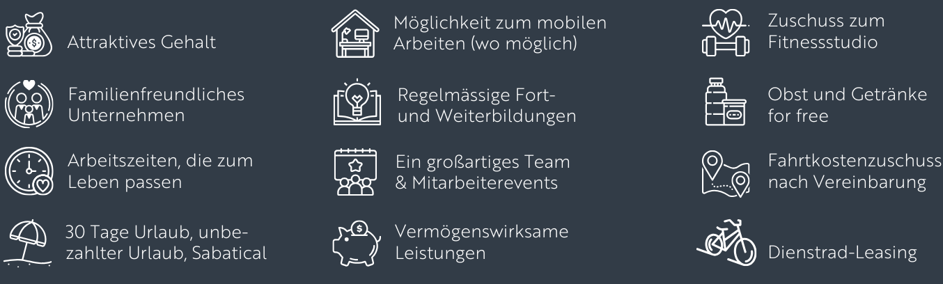 Suchen Sie ein familiäres Team, in dem Sie Ihre Fähigkeiten optimal einbringen können? Schätzen Sie kurze Entscheidungswege und flache Hierarchien? Wünschen Sie sich einen Arbeitgeber, der Ihnen viel Flexibilität bietet und neben einem attraktiven Gehalt zahlreiche Zusatzleistungen bereithält? Dann sollten wir uns unbedingt kennenlernen!