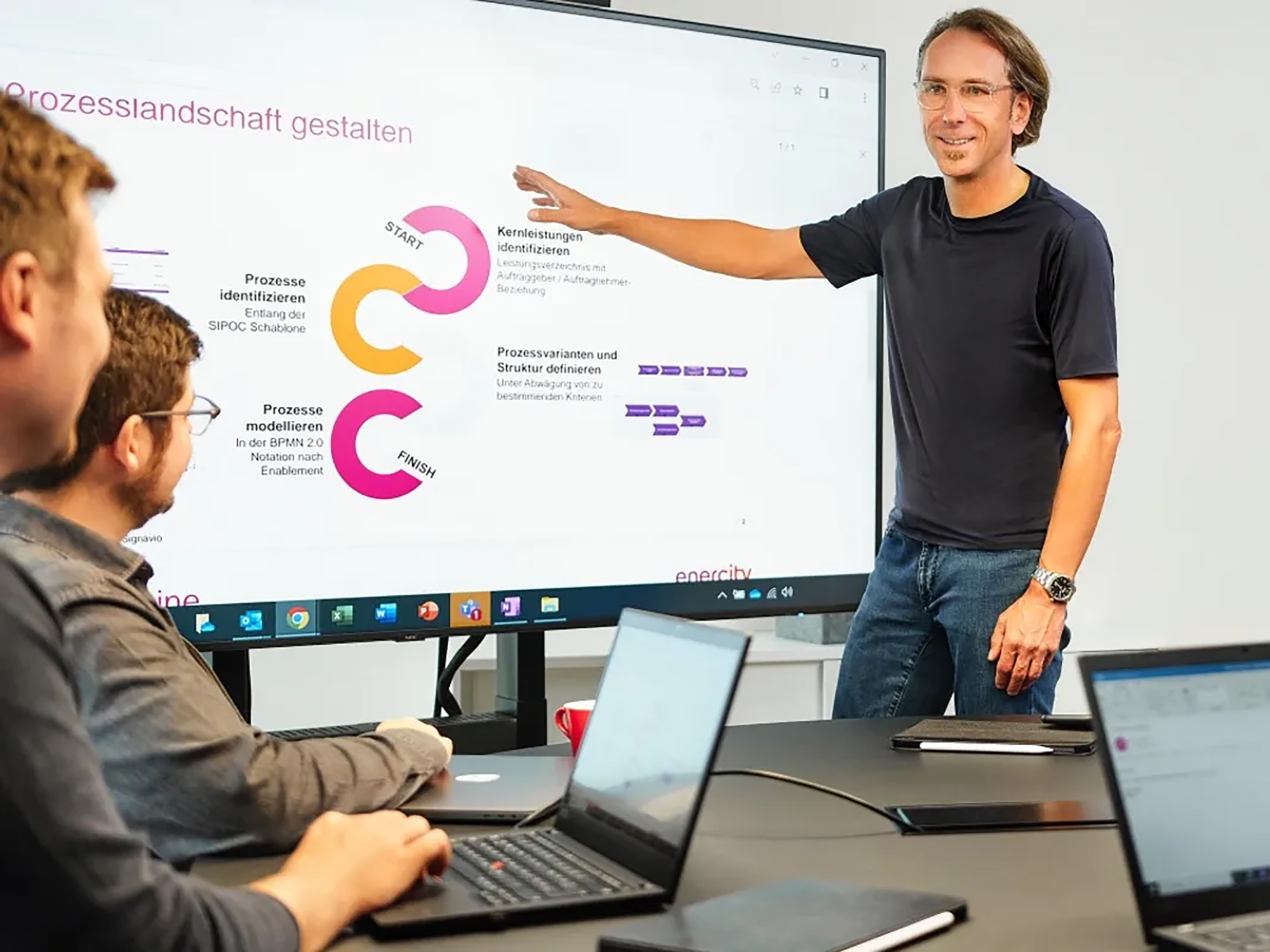 Am ersten Arbeitstag erwartet dich ein ausgestatteter Arbeitsplatz und ein Pate, der dich beim Ankommen unterstützt. Mit deinem Team erfährst du in der ersten Woche, was es mit unseren Networking-Meetings auf sich hat.
